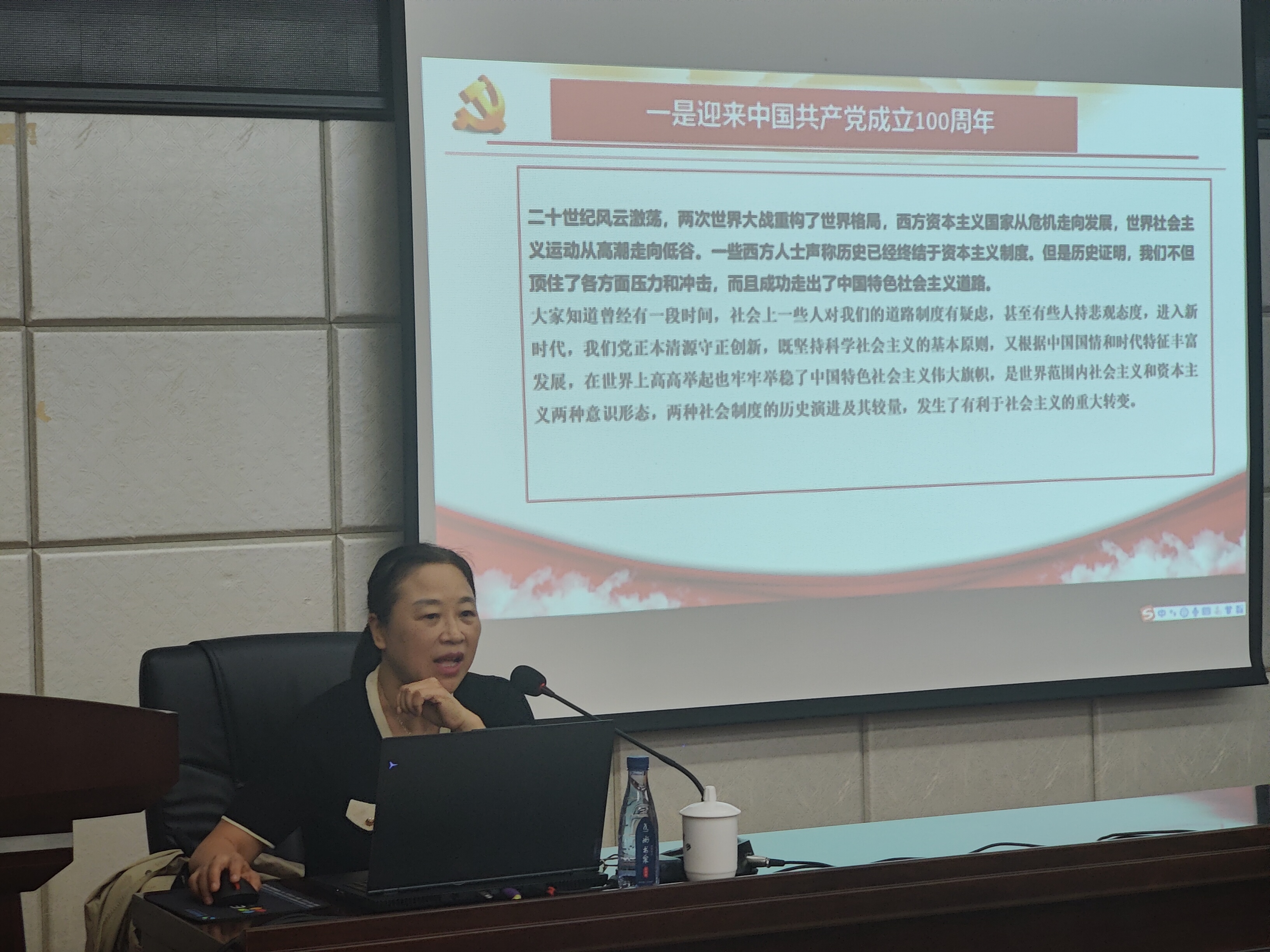 潘柳英老师以《踔厉奋发创伟业 凝心铸魂奔复兴——开展好学习贯彻习近平新时代中国特色社会主义思想主题教育》为主题,重点从深刻理解开展主题教育的重要意义、科学理解主题教育的总要求和根本任务、习近平新时代中国特色社会主义思想的丰富内涵、如何使主题教育走深走实4个方面,生动讲解了习近平新时代中国特色社会主义思想的科学体系及鲜明特质。专题党课主题鲜明、内涵丰富,思想深刻,既有理论高度、思想深度,又有很强的针对性和指导性,让全体党员干部深受教育和启发。