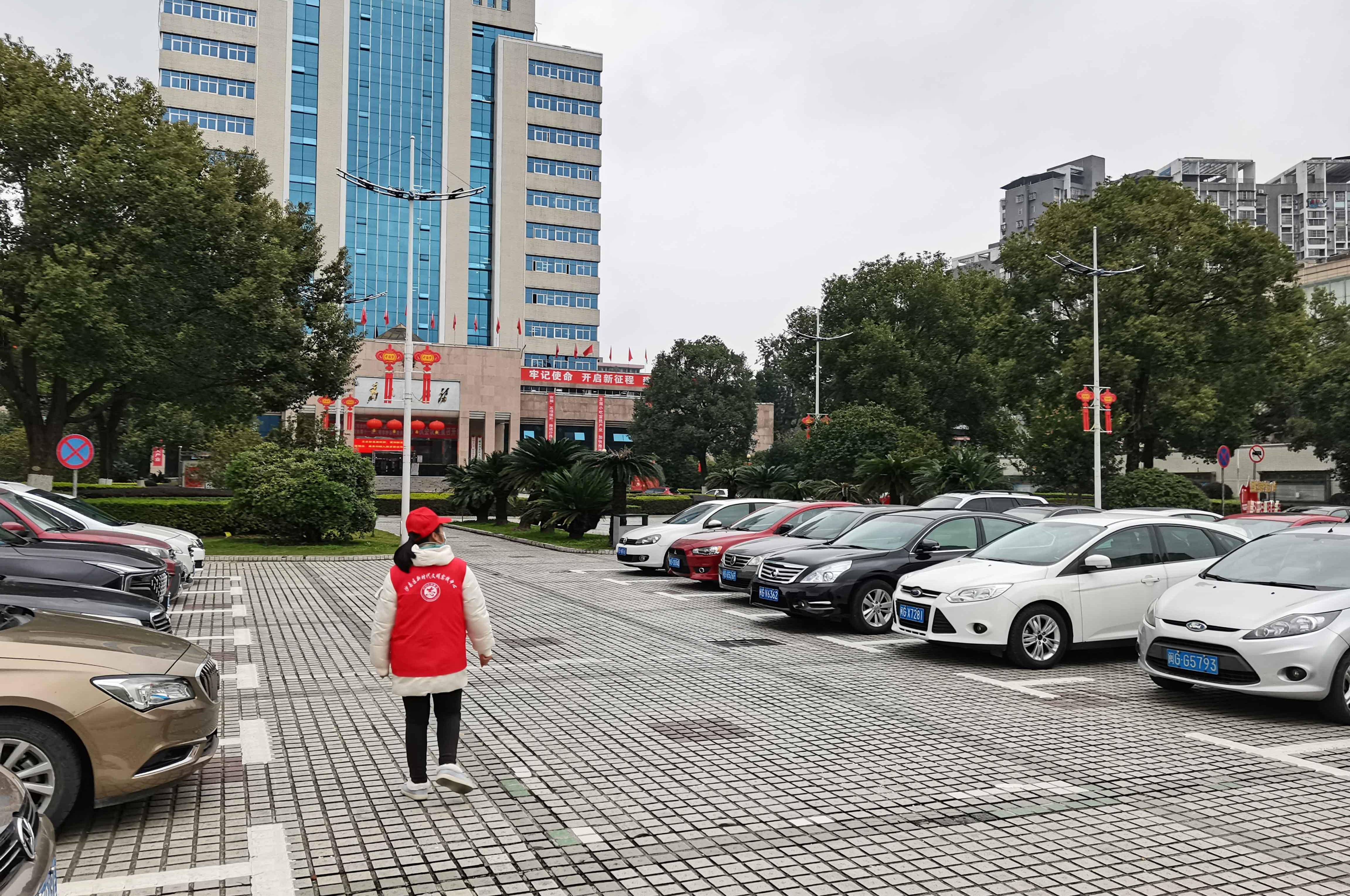 12月30日,区政府大楼前广场临时停车场正式启用。有一群“小红帽”们在这里维持着秩序。