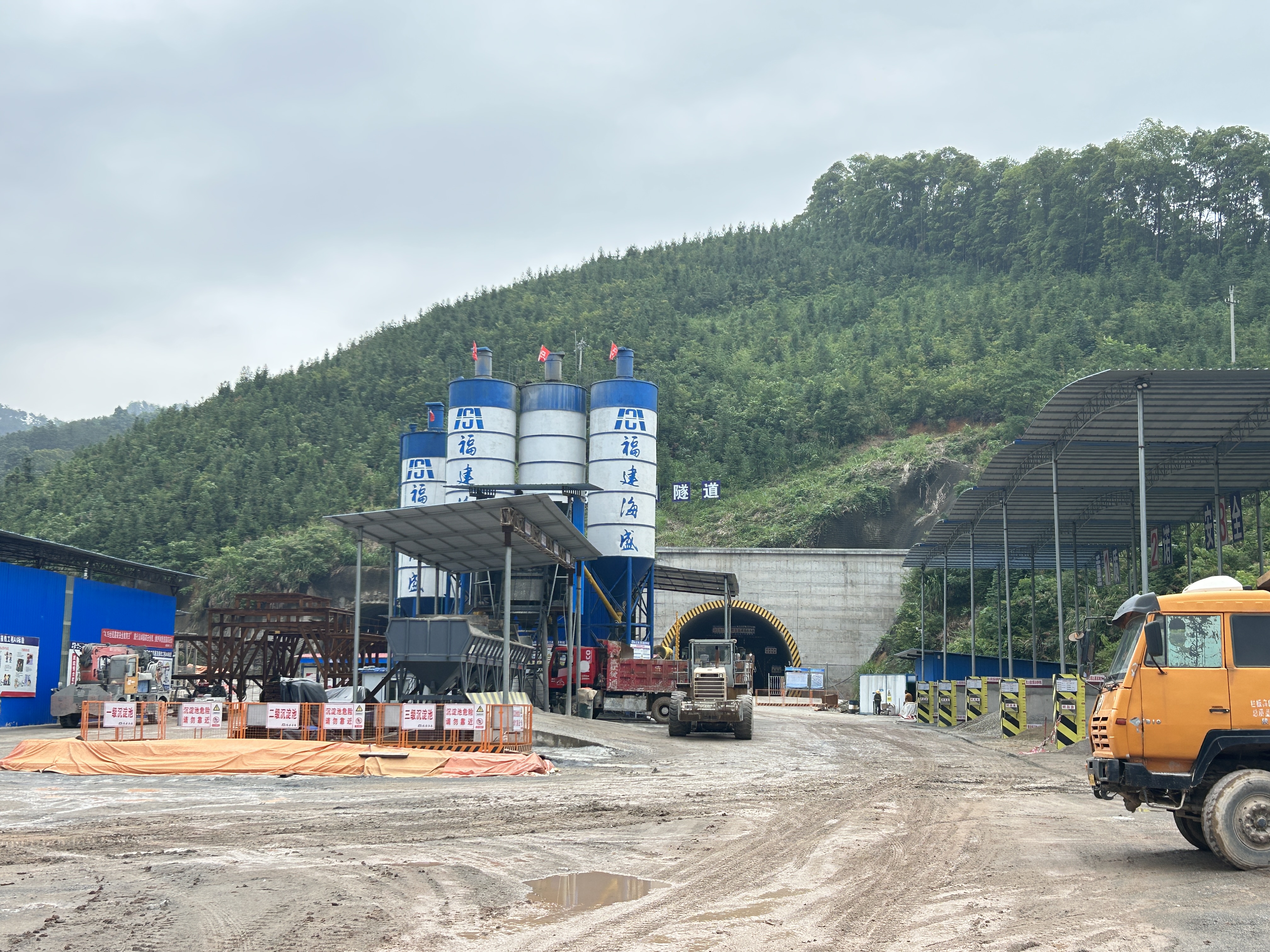 地磅基础开挖,进行混凝土拌合站地坪硬化、钢筋加工厂地面硬化。完成隧道开挖300m³。
