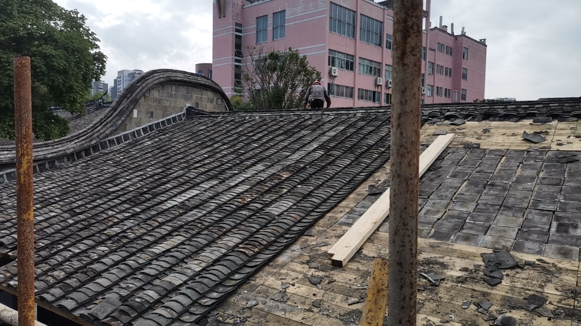 完成第二进屋面挂瓦、地面砖清理工作,进行第一进及后院院墙修复,木构加工。