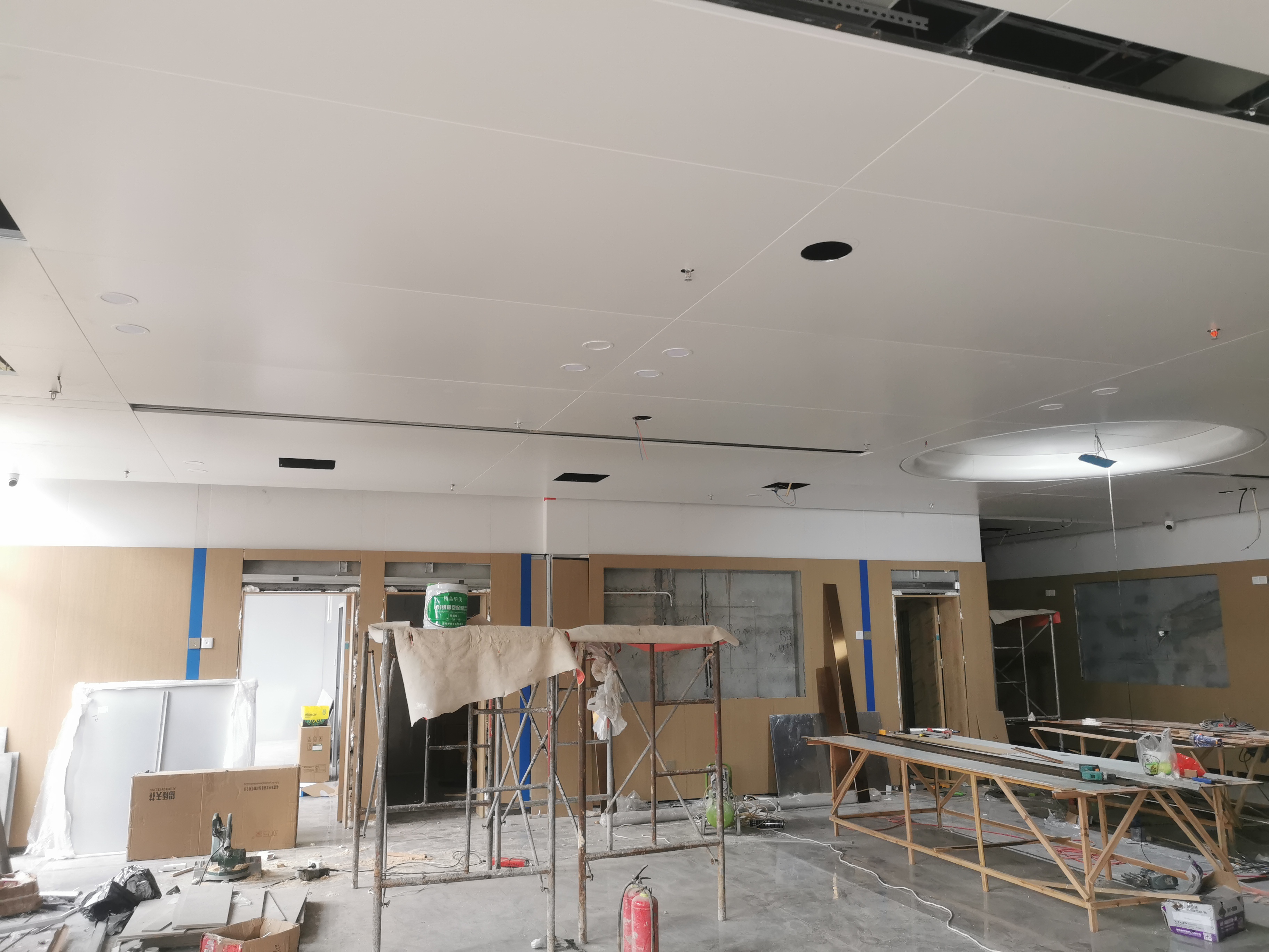 进行地下室顶板石材铺贴、回填区换填、垫层浇筑、西侧水泥路面浇筑,污水站开挖。完成插座面板安装,灯具安装完成90%,大厅墙板、吊顶安装完成95%。