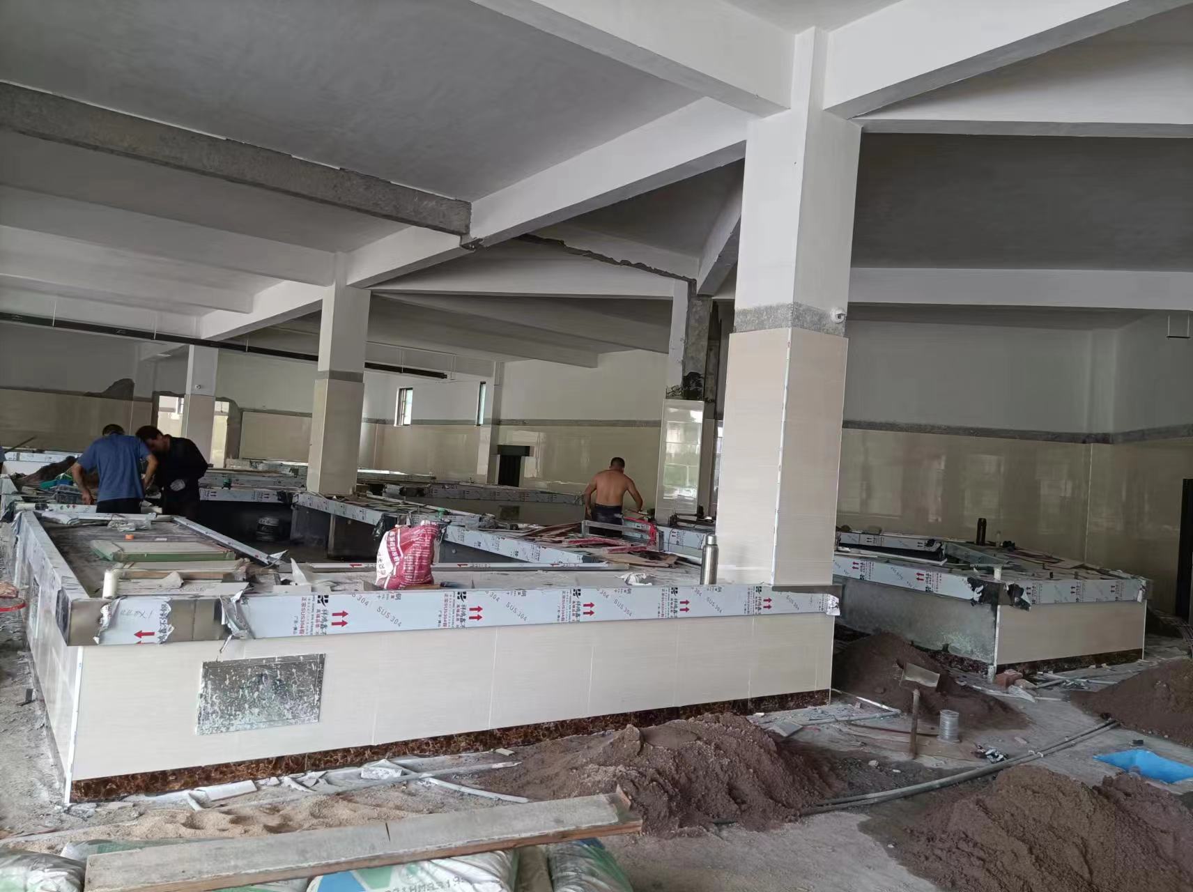 进行摊位贴砖施工,累计完成总工程量的70%。