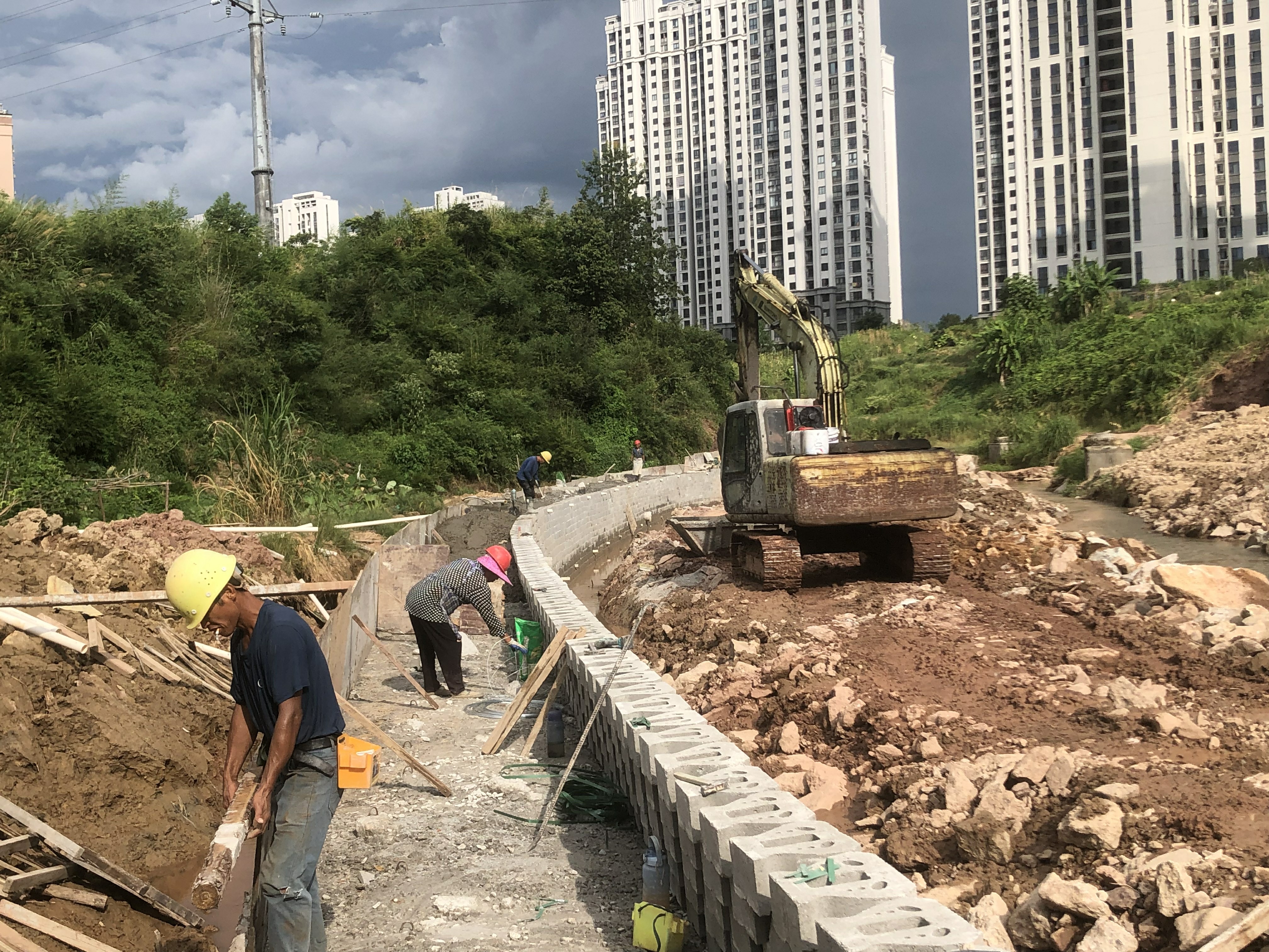 1、沙县东溪畔溪河道治理工程宜和佳宛段左岸45米混凝土浇筑。长富平台原规划桥位置缺口施工 。