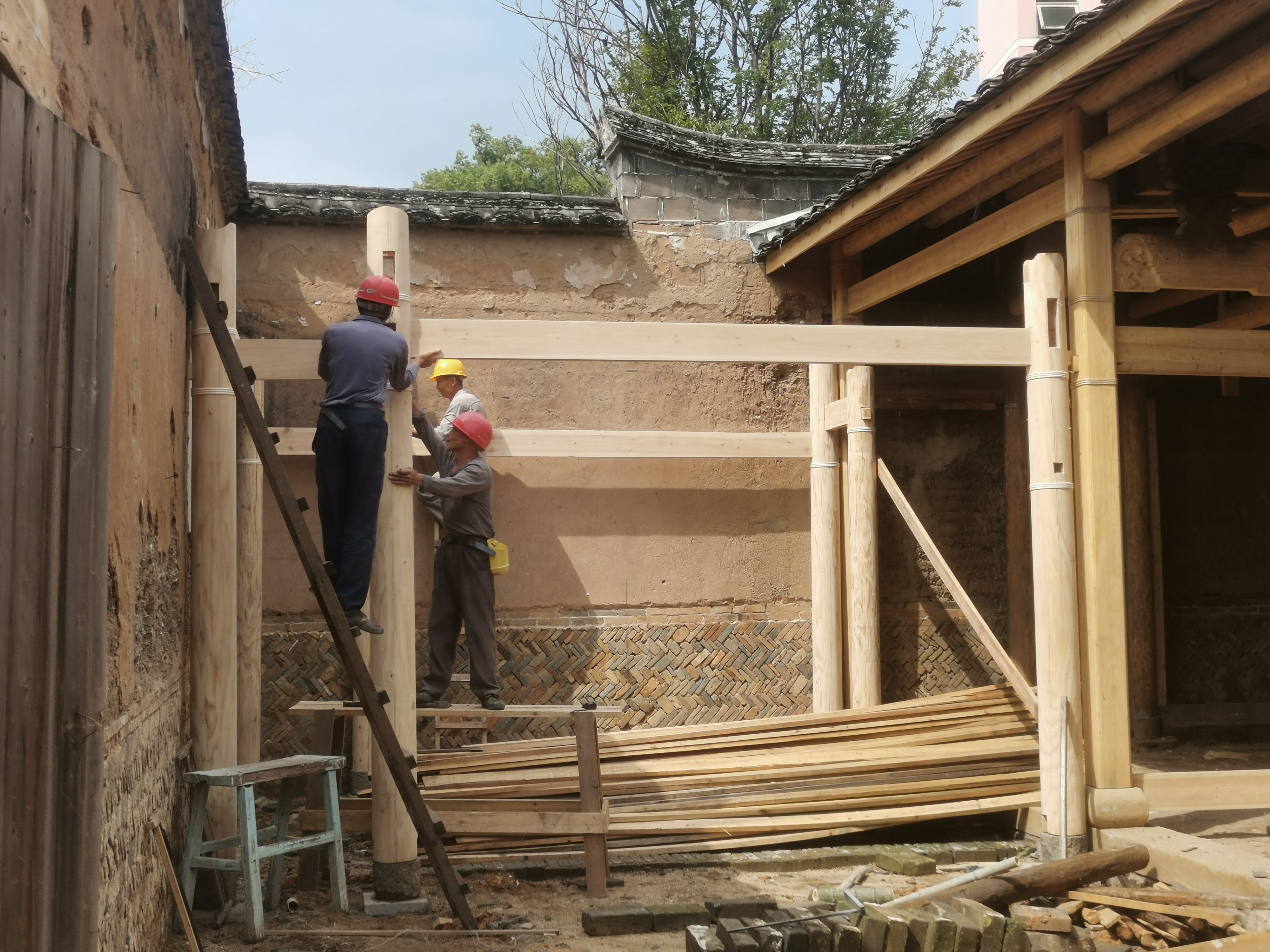 完成8号院主厅屋面木望板铺设、地面平整,持续推进6号和8号院连廊木构件安装。