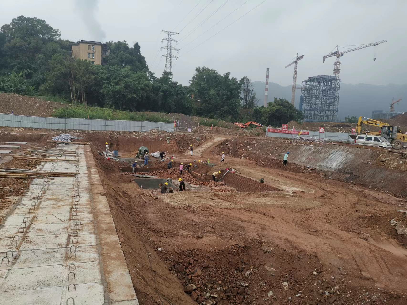 进行污水站桩基检测、底板钢筋绑扎和模板安装。