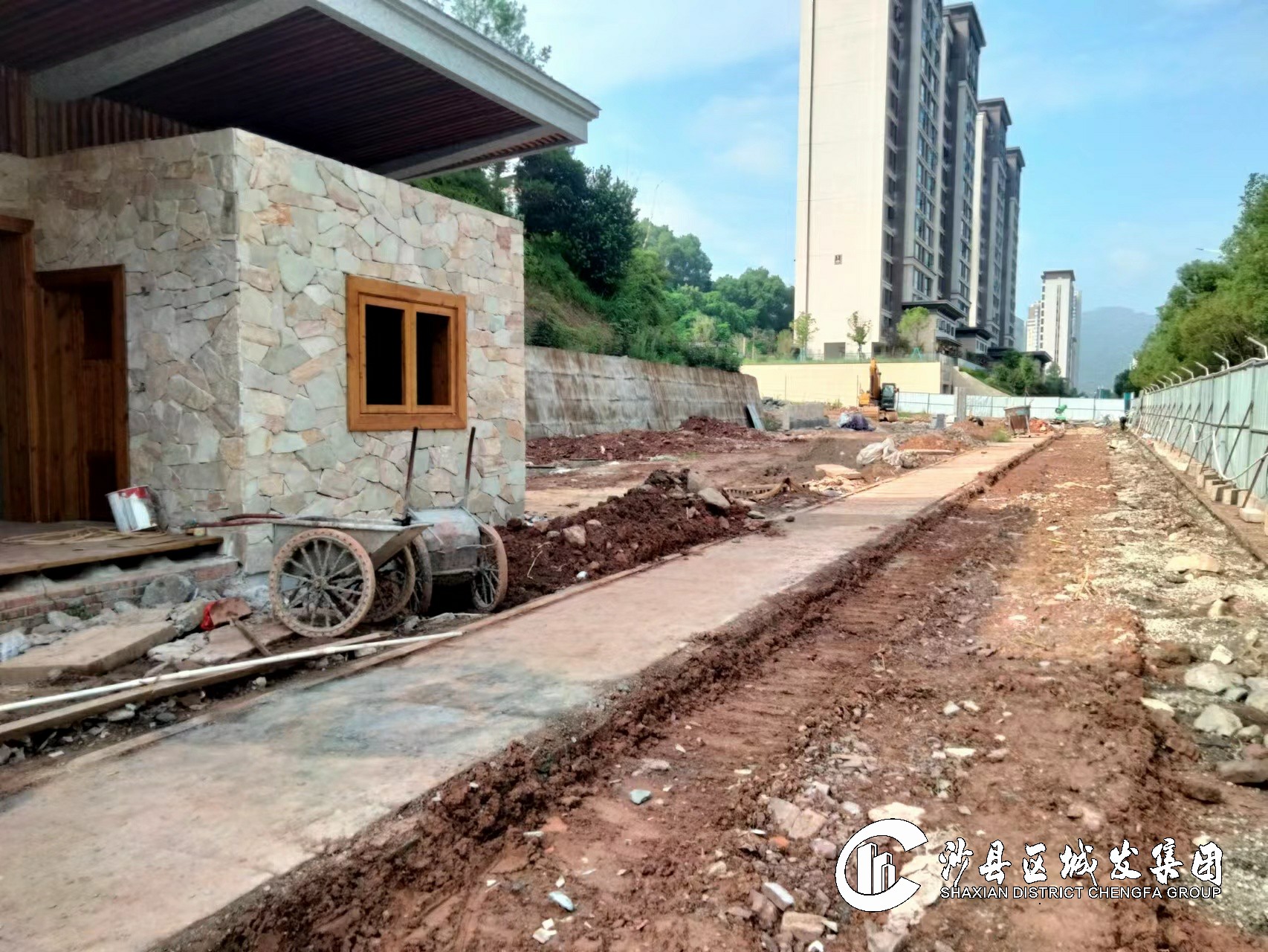 完成土方回填300立方米。完成景观孤形矮墙文化石黏贴,景观小山包种植土回填,累计完成总工程量的30%。