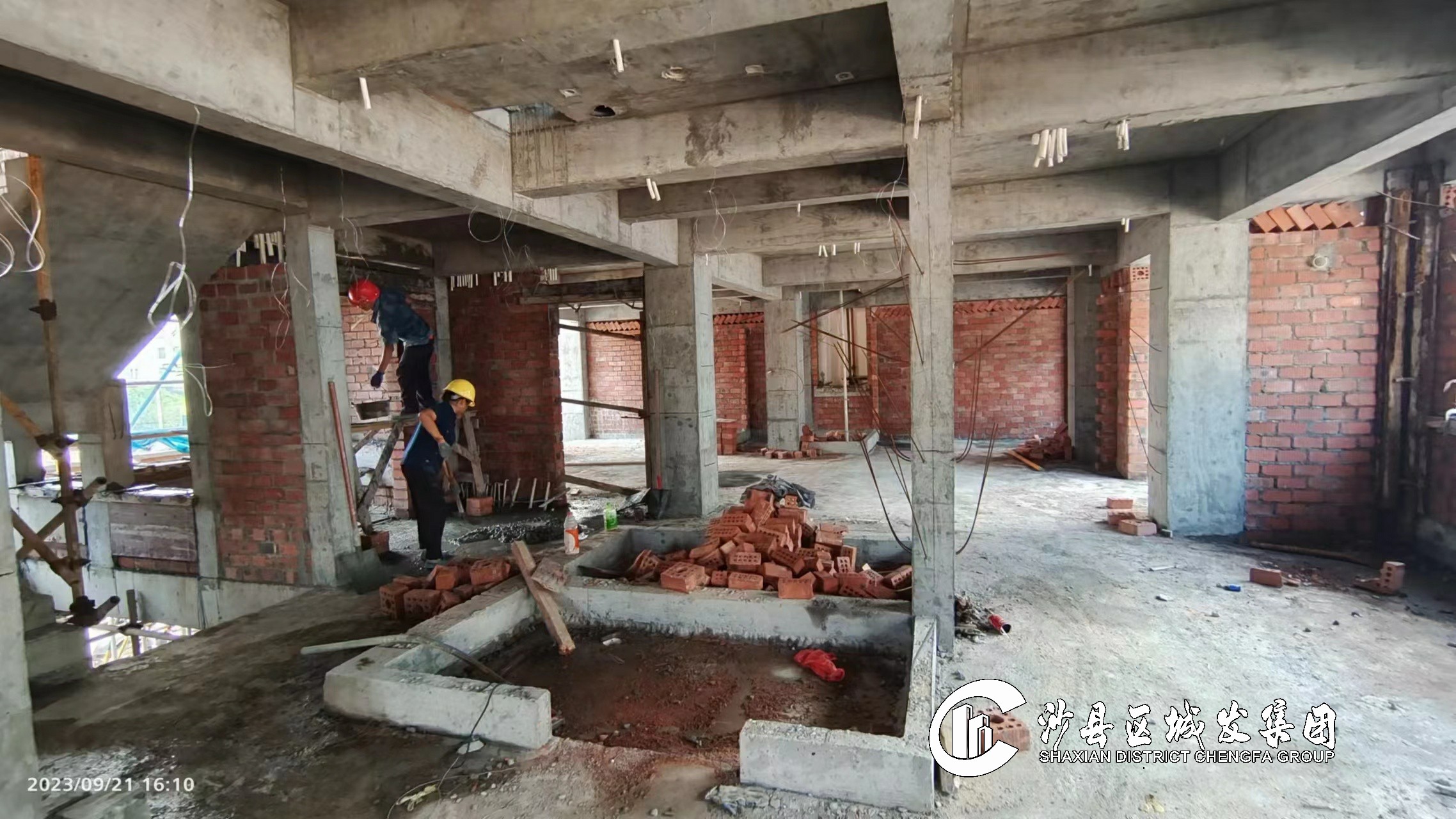 完成屋面构架层梁板柱施工、一层和二层砌体施工。