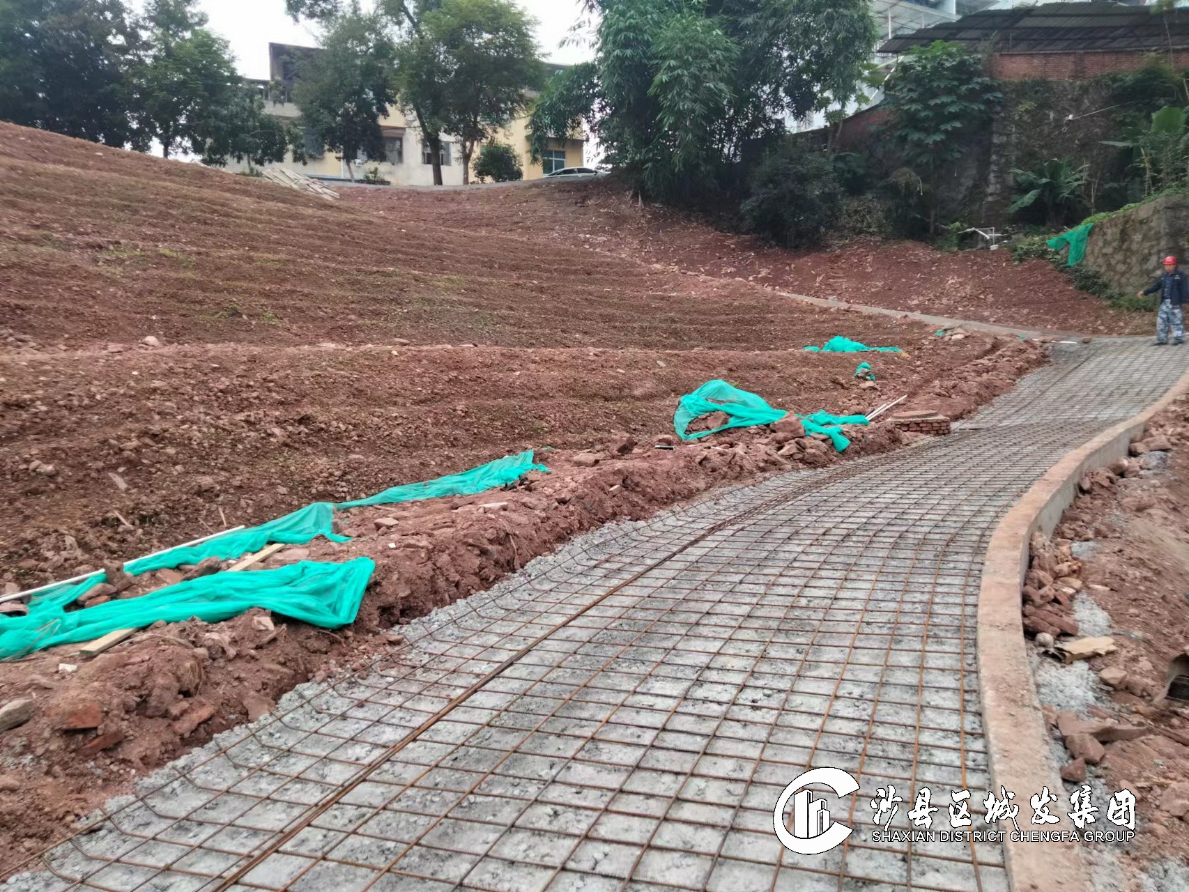 绿化施工完成80%,山坡草籽撒播完成80%。进行山坡步道石材及PC砖铺贴,累计完成总工程量的38%。