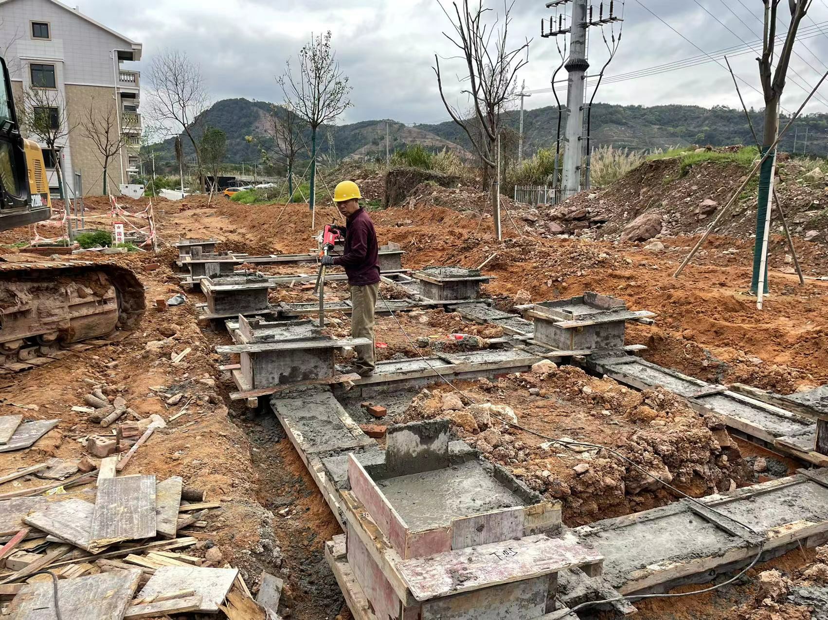 完成中分路弱电管道埋设和街心公园长廊基础浇筑。