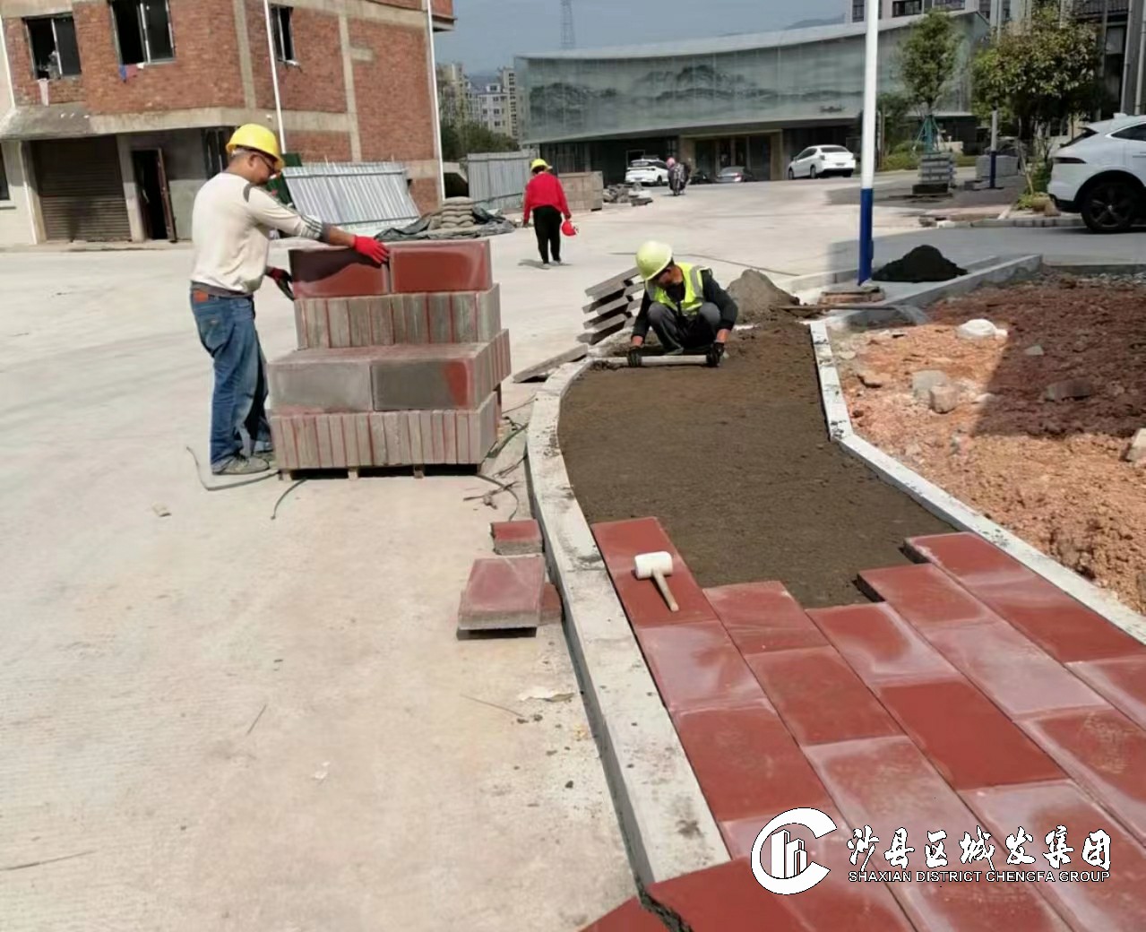 持续推进步道两侧草皮铺贴和建国市场周边道路东侧段路面沥青铺设。